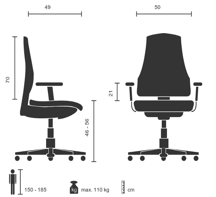Principales fonctions en un clin d'œil : rotation à 360 degrés et réglable en hauteur, fonction bascule (contre-pression pour le réglage du poids réglable avec bouton rotatif, placé sous le siège).